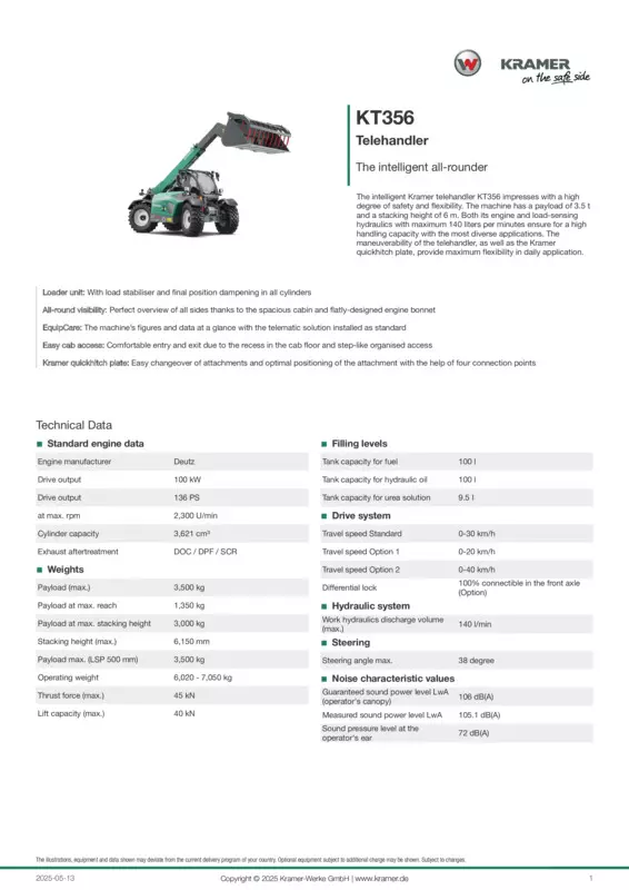 The intelligent Kramer telehandler KT356 impresses with a high degree of safety and flexibility. The machine has a payload of 3.5 t and a stacking height of 6 m. Both its engine and load-sensing hydraulics with maximum 140 liters per minutes ensure for a high handling capacity with the most diverse applications. The maneuverability of the telehandler, as well as the Kramer quickhitch plate, provide maximum flexibility in daily application.