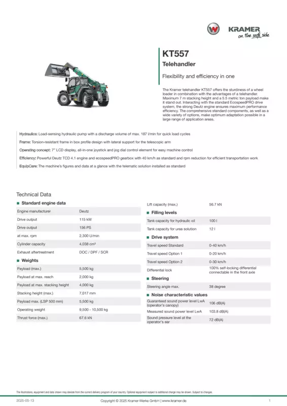 The Kramer telehandler KT557 offers the sturdiness of a wheel loader in combination with the advantages of a telehandler. Maximum 7 m stacking height and a 5.5 metric ton payload make it stand out. Interacting with the standard EcospeedPRO drive system, the strong Deutz engine ensures maximum performance efficiency. The comprehensive standard components, as well as a wide variety of options, make optimum adaptation possible in a large range of application areas.