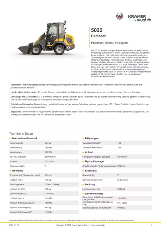 Der 5035, aus der Kompaktklasse von Kramer, ist agil in seiner Bewegung, dynamisch in seiner Leistungsentfaltung und schlank in seiner Bauart. Mit optimiertem Leistungsgewicht, geringem Transportgewicht und konstant hoher Nutzlast ist er der ideale Helfer auf Baustellen im Straßenbau, Tiefbau, Gartenbau und Landschaftsbau. Mit seinen Maßen ist er außerdem prädestiniert für niedrige Durchfahrtshöhen und enge Passagen. Durch eine Breite von nur 1,26 m sind Fahrten auf einem Gehweg mühelos möglich. Außerdem ist die Maschine aufgrund des geringen Transportgewichts auch auf einem PKW-Anhänger transportierbar und somit ist eine schnelle Überfahrt zu verschiedenen Einsatzorten kein Problem.