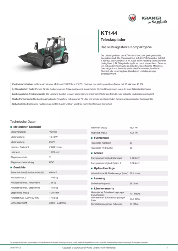 Die Leistungsdaten des KT144 sind trotz der geringen Maße beeindruckend. Die Stapelnutzlast auf der Palettengabel beträgt 1.450 kg, die Hubhöhe 4,5 m. Auch beim Handling von schweren Ladegütern (z.B. Silageballen) gibt es damit ausreichend Reserve, um mit großer Reichweite zu arbeiten. Die effiziente Maschine überzeugt durch ihren dynamischen Fahrantrieb, ihre hohe Nutzlast, die unschlagbare Wendigkeit und das geringe Einsatzgewicht.