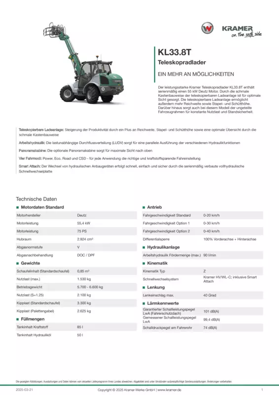 Der leistungsstarke Kramer Teleskopradlader KL33.8T enthält serienmäßig einen 55 kW Deutz Motor. Durch die schmale Kastenbauweise der teleskopierbaren Ladeanlage ist für optimale Sicht gesorgt. Die teleskopierbare Ladeanlage ermöglicht außerdem mehr Reichweite sowie Stapel- und Schütthöhe. Darüber hinaus sorgt auch bei diesem Modell der ungeteilte Fahrzeugrahmen für konstante Nutzlast und Standsicherheit.