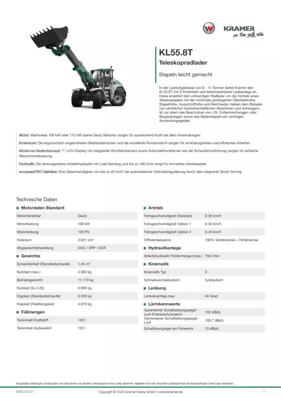 In der Leistungsklasse von 9 - 11 Tonnen bietet Kramer den KL55.8T mit Z-Kinematik und teleskopierbarer Ladeanlage an. Diese erweitert den vollwertigen Radlader um die Vorteile eines Teleskopladers mit der nochmals gesteigerten Überladehöhe, Stapelhöhe, Ausschütthöhe und Reichweite. Neben dem Beladen von sämtlichen landwirtschaftlichen Maschinen und Anhängern, ist vor allem das Beschicken von z.B. Futtermischwagen oder Biogasanlagen sowie das Ballenstapeln ein wichtiges Anwendungsgebiet.