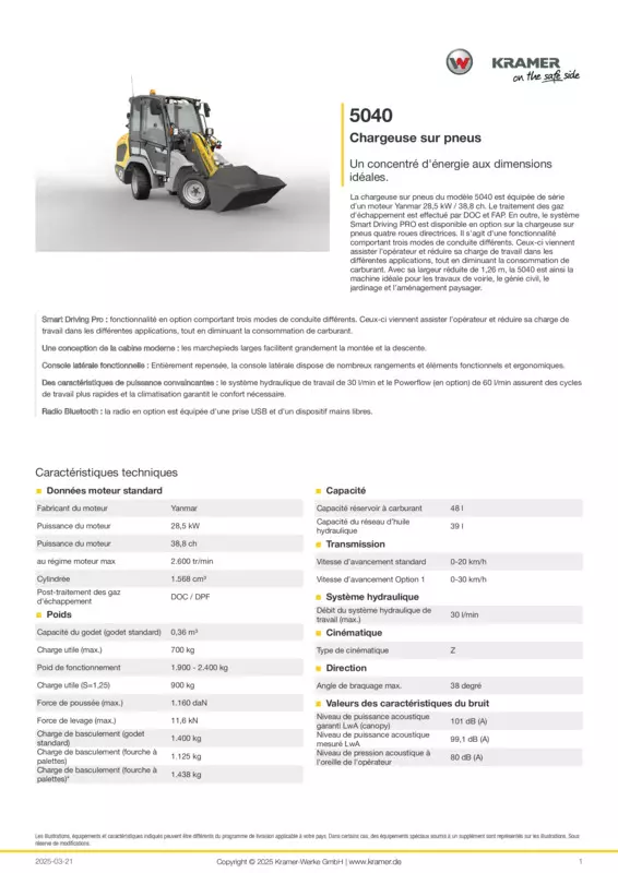 La chargeuse sur pneus du modèle 5040 est équipée de série d’un moteur Yanmar 28,5 kW / 38,8 ch. Le traitement des gaz d'échappement est effectué par DOC et FAP. En outre, le système Smart Driving PRO est disponible en option sur la chargeuse sur pneus quatre roues directrices. Il s'agit d'une fonctionnalité comportant trois modes de conduite différents. Ceux-ci viennent assister l’opérateur et réduire sa charge de travail dans les différentes applications, tout en diminuant la consommation de carburant. Avec sa largeur réduite de 1,26 m, la 5040 est ainsi la machine idéale pour les travaux de voirie, le génie civil, le jardinage et l’aménagement paysager.
