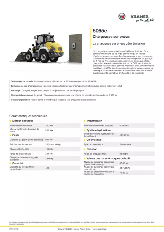 La chargeuse sur pneus électrique 5065e est équipée d’une batterie lithium-ions de 96 V qui permet jusqu’à 4 heures d’autonomie sans recharge. La chargeuse sur pneus propose en outre des dimensions compactes et une charge utile de gerbage de 1 750 kg. Avec la chargeuse entièrement électrique 5065e, dites adieu aux restrictions d'émissions de CO2, aux limites de particules ou aux niveaux sonores maximaux dans votre travail au quotidien. La 5065e fonctionne sans émissions locales, ce qui est bénéfique pour l’environnement et l’utilisateur, mais elle marque aussi des points en matière d’efficacité et de rentabilité.