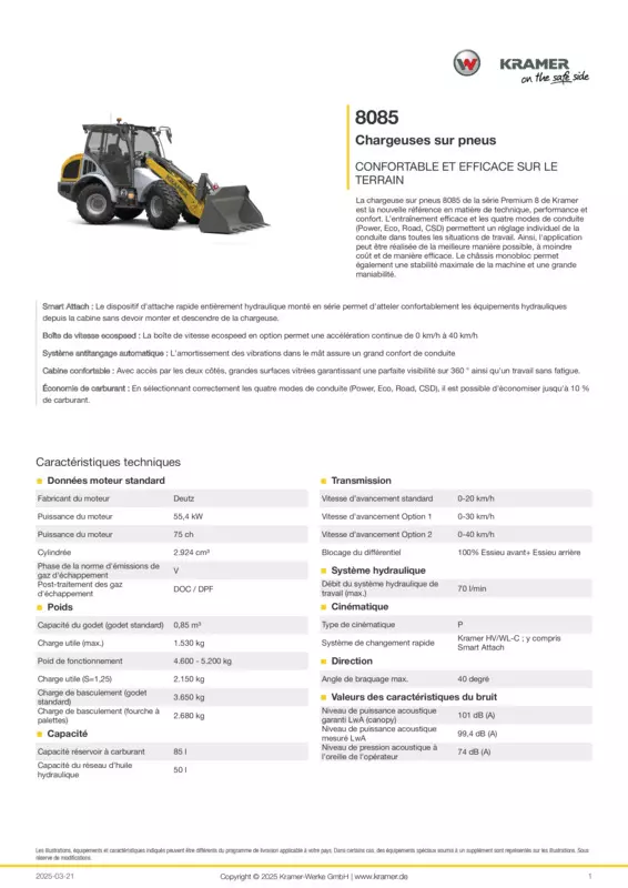 La chargeuse sur pneus 8085 de la série Premium 8 de Kramer est la nouvelle référence en matière de technique, performance et confort. L’entraînement efficace et les quatre modes de conduite (Power, Eco, Road, CSD) permettent un réglage individuel de la conduite dans toutes les situations de travail. Ainsi, l'application peut être réalisée de la meilleure manière possible, à moindre coût et de manière efficace. Le châssis monobloc permet également une stabilité maximale de la machine et une grande maniabilité.