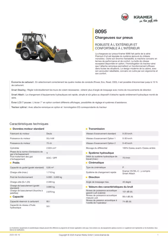 La chargeuse sur pneus Kramer 8095 fait partie de la série Premium 8 et est équipée du système éprouvé du châssis monobloc. Outre son énorme maniabilité, la machine convainc en termes de performance et de confort. La boîte de vitesse ecospeed disponible en option, l'homologation du tracteur ainsi que l'attache-remorque permettent un fonctionnement efficace dans toutes les situations. Le design moderne de la cabine, avec son accoudoir rabattable, convainc en outre par son ergonomie et son confort.