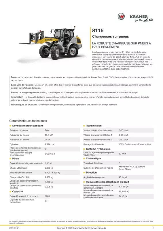 La chargeuse sur pneus Kramer 8115 fait partie de la série Premium 8 et est équipée du système éprouvé du châssis monobloc. Le volume de godet allant de 1,15 à 1,8 m³ selon la densité du matériau associé à la motorisation haute performance unique fait de la 8115 une véritable chargeuse sur pneus très efficace. La boîte de vitesse ecospeed disponible en option et les pneumatiques de grande taille permettent de réaliser de nombreuses tâches avec cette machine.