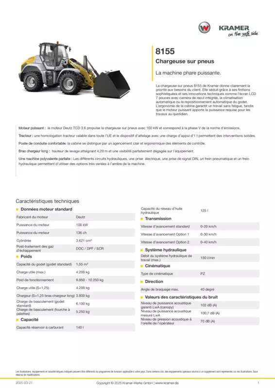 La chargeuse sur pneus 8155 de Kramer donne clairement la priorité aux besoins du client. Elle séduit grâce à ses finitions sophistiquées et ses innovations techniques comme l’écran LCD 7 pouces avec caméra de recul intégrée, la climatisation automatique ou le repositionnement automatique du godet. L’ergonomie de la cabine garantit un travail sans fatigue, tandis que le moteur puissant apporte la puissance requise pour les travaux au quotidien.