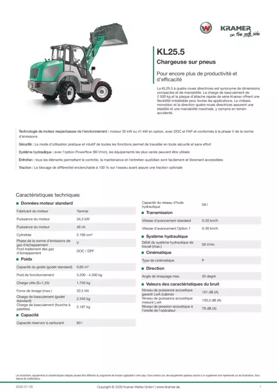 La KL25.5 à quatre roues directrices est synonyme de dimensions compactes et de maniabilité. La charge de basculement de 2 500 kg et la plaque d’attache rapide de série Kramer offrent une flexibilité imbattable pour toutes les applications. Le châssis monobloc et la direction quatre roues directrices assurent une stabilité et une maniabilité maximale, y compris en terrain accidenté.