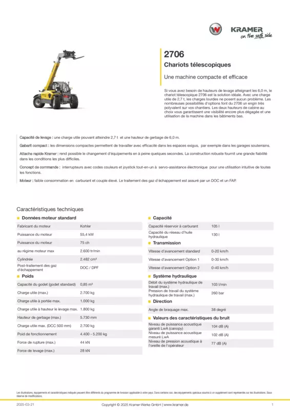 Si vous avez besoin de hauteurs de levage atteignant les 6,0 m, le chariot télescopique 2706 est la solution idéale. Avec une charge utile de 2,7 t, les charges lourdes ne posent aucun problème. Les nombreuses possibilités d'options font du 2706 un engin très polyvalent sur vos chantiers. Les deux hauteurs de cabine au choix vous garantissent une visibilité encore plus dégagée et une utilisation de la machine dans les bâtiments bas.