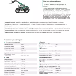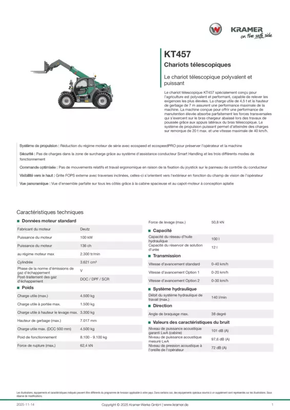 Le chariot télescopique KT457 spécialement conçu pour l’agriculture est polyvalent et performant, capable de relever les exigences les plus élevées. La charge utile de 4,5 t et la hauteur de gerbage de 7 m assurent une performance maximale de la machine. La machine conçue pour offrir une performance de manutention élevée absorbe parfaitement les forces transversales qui s’exercent sur le bras chargeur abaissé lors des travaux de poussée grâce aux appuis latéraux du bras télescopique. Le système de propulsion puissant permet d’atteindre des charges sur remorque de 20 t max. et une vitesse maximale de 40 km/h.
