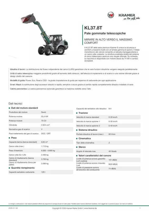 Il KL37.8T della serie premium Kramer 8 unisce la sicurezza e comfort a massimo livelli con un'ampia gamma di opzioni. Il telaio monoblocco del veicolo consente un'elevata maneggevolezza e un carico utile costante. La struttura scatolata stretta del sistema di carico telescopico assicura una visuale ottimale. Su richiesta, la macchina è disponibile con motore Deutz da 74 kW e cambio ecospeed.