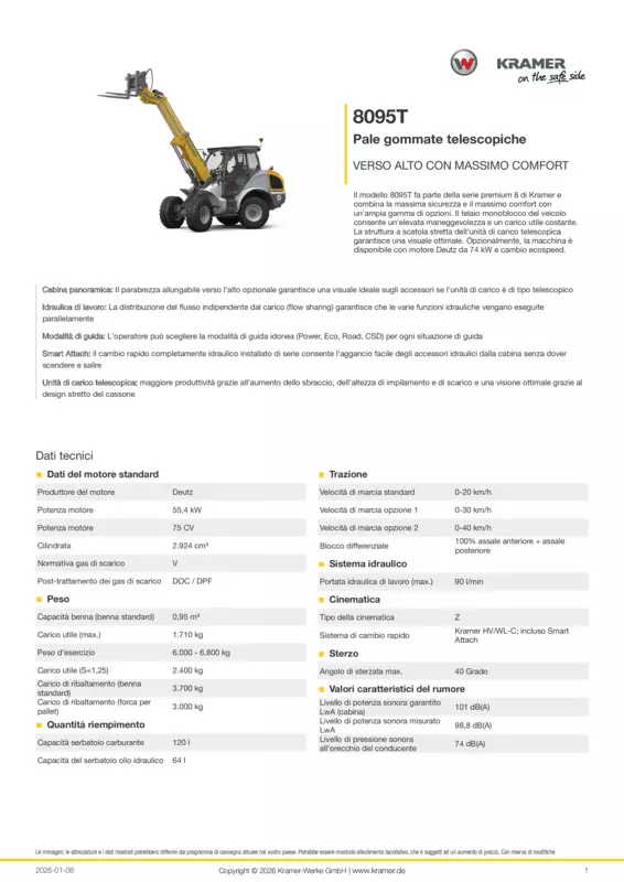 Il modello 8095T fa parte della serie premium 8 di Kramer e combina la massima sicurezza e il massimo comfort con un'ampia gamma di opzioni. Il telaio monoblocco del veicolo consente un'elevata maneggevolezza e un carico utile costante. La struttura a scatola stretta dell'unità di carico telescopica garantisce una visuale ottimale. Opzionalmente, la macchina è disponibile con motore Deutz da 74 kW e cambio ecospeed.