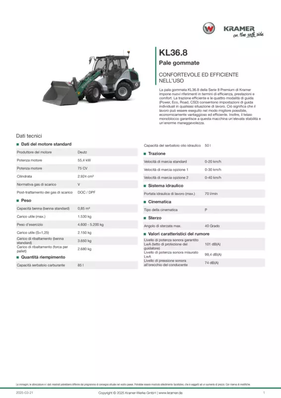 La pala gommata KL36.8 della Serie 8 Premium di Kramer impone nuovi riferimenti in termini di efficienza, prestazioni e comfort. La trazione efficiente e le quattro modalità di guida (Power, Eco, Road, CSD) consentono impostazioni di guida individuali in qualsiasi situazione di lavoro. Ciò significa che il lavoro può essere eseguito nel modo migliore possibile, economicamente vantaggioso ed efficiente. Inoltre, il telaio monoblocco garantisce a questa macchina un'elevata stabilità e un'enorme maneggevolezza.
