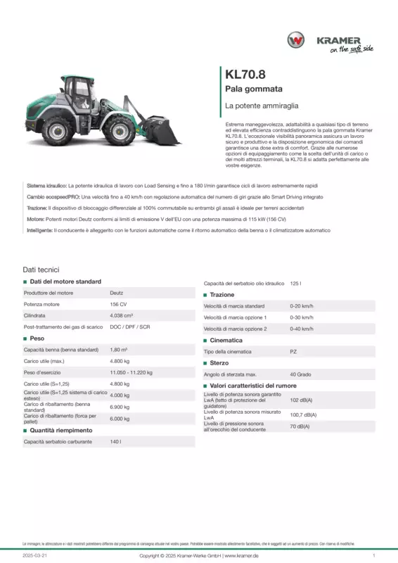 Estrema maneggevolezza, adattabilità a qualsiasi tipo di terreno ed elevata efficienza contraddistinguono la pala gommata Kramer KL70.8. L'eccezionale visibilità panoramica assicura un lavoro sicuro e produttivo e la disposizione ergonomica dei comandi garantisce una dose extra di comfort. Grazie alle numerose opzioni di equipaggiamento come la scelta dell'unità di carico o dei molti attrezzi terminali, la KL70.8 si adatta perfettamente alle vostre esigenze.
