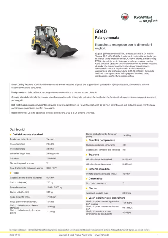 La pala gommata modello 5040 è dotata di serie di un motore Yanmar 28,5 kW / 38,8 CV. Il sistema di post-trattamento dei gas di scarico viene effettuato con DOC e DPF. Inoltre, Smart Driving PRO è disponibile su richiesta per la pala gommata a quattro ruote sterzanti. Questa è una funzionalità con tre diverse modalità di guida, che supportano l’operatore in ogni applicazione, alleviando lo sforzo e risparmiando anche carburante. Abbinandolo alla larghezza ridotta di {1,26 m}XX in}, il modello 5040 è il compagno ideale nell’ingegneria stradale, civile, giardinaggio e architettura paesaggistica.