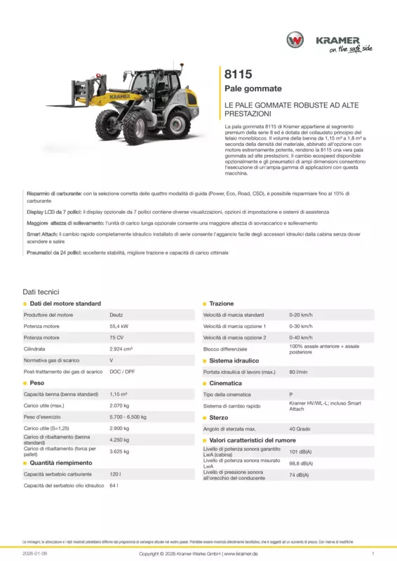 La pala gommata 8115 di Kramer appartiene al segmento premium della serie 8 ed è dotata del collaudato principio del telaio monoblocco. Il volume della benna da 1,15 m³ a 1,8 m³ a seconda della densità del materiale, abbinato all'opzione con motore estremamente potente, rendono la 8115 una vera pala gommata ad alte prestazioni. Il cambio ecospeed disponibile opzionalmente e gli pneumatici di ampi dimensioni consentono l'esecuzione di un'ampia gamma di applicazioni con questa macchina.