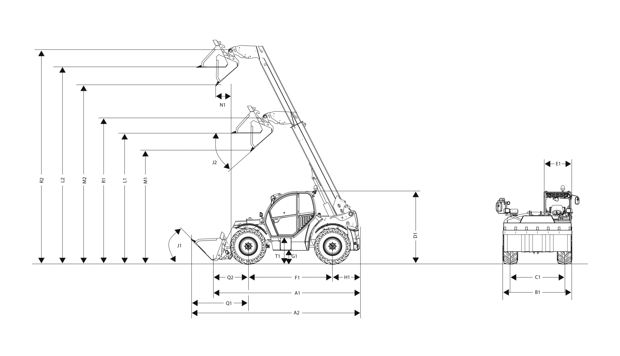 Q1 | Distanza dal centro della ruota anteriore fino al bordo anteriore della benna | 1.770 mm |