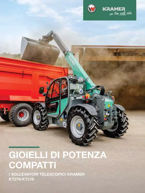 La combinazione di dimensioni esterne compatte, elevato carico utile e potenza del motore consente al sollevatore telescopico KT316 di essere il gioiello di potenza compatto del portafoglio Kramer. Il sollevatore telescopico solleva fino a 3.100 kg fino a un'altezza di sollevamento massima di 5,83 m. Il motore Deutz con una potenza massima di 82 kW / 112 CV garantisce l'elevata agilità e le alte prestazioni della macchina. L'ampia dotazione di serie comprende una velocità massima di 40 km/h, una ventola reversibile con funzione automatica e quattro tipi di sterzo con sincronizzazione automatica.