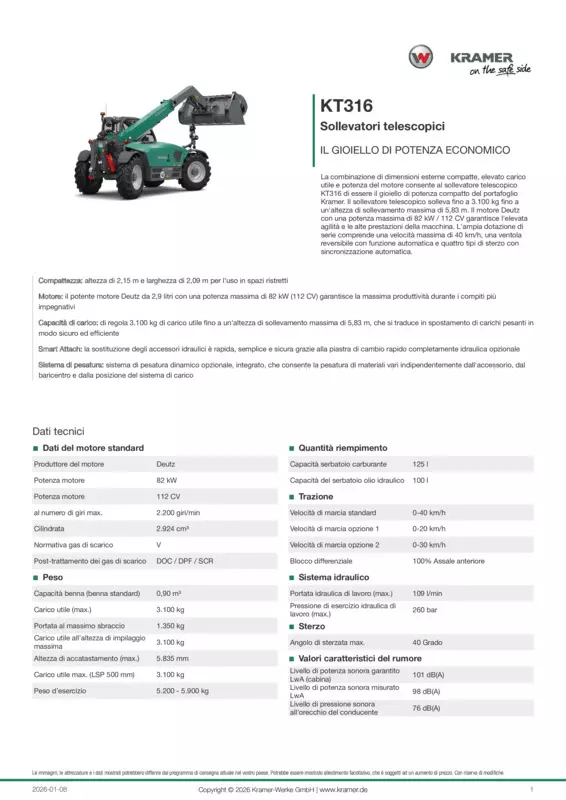 La combinazione di dimensioni esterne compatte, elevato carico utile e potenza del motore consente al sollevatore telescopico KT316 di essere il gioiello di potenza compatto del portafoglio Kramer. Il sollevatore telescopico solleva fino a 3.100 kg fino a un'altezza di sollevamento massima di 5,83 m. Il motore Deutz con una potenza massima di 82 kW / 112 CV garantisce l'elevata agilità e le alte prestazioni della macchina. L'ampia dotazione di serie comprende una velocità massima di 40 km/h, una ventola reversibile con funzione automatica e quattro tipi di sterzo con sincronizzazione automatica.