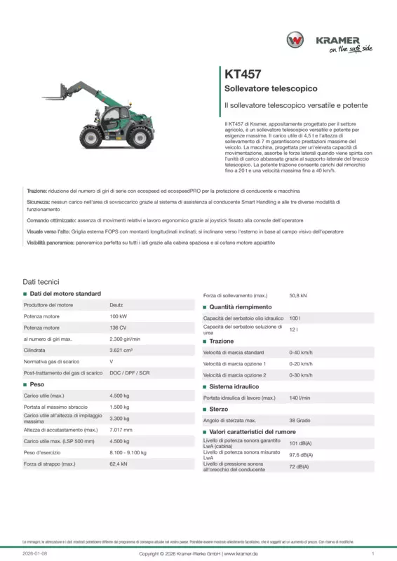Il KT457 di Kramer, appositamente progettato per il settore agricolo, è un sollevatore telescopico versatile e potente per esigenze massime. Il carico utile di 4,5 t e l'altezza di sollevamento di 7 m garantiscono prestazioni massime del veicolo. La macchina, progettata per un'elevata capacità di movimentazione, assorbe le forze laterali quando viene spinta con l’unità di carico abbassata grazie al supporto laterale del braccio telescopico. La potente trazione consente carichi del rimorchio fino a 20 t e una velocità massima fino a 40 km/h.