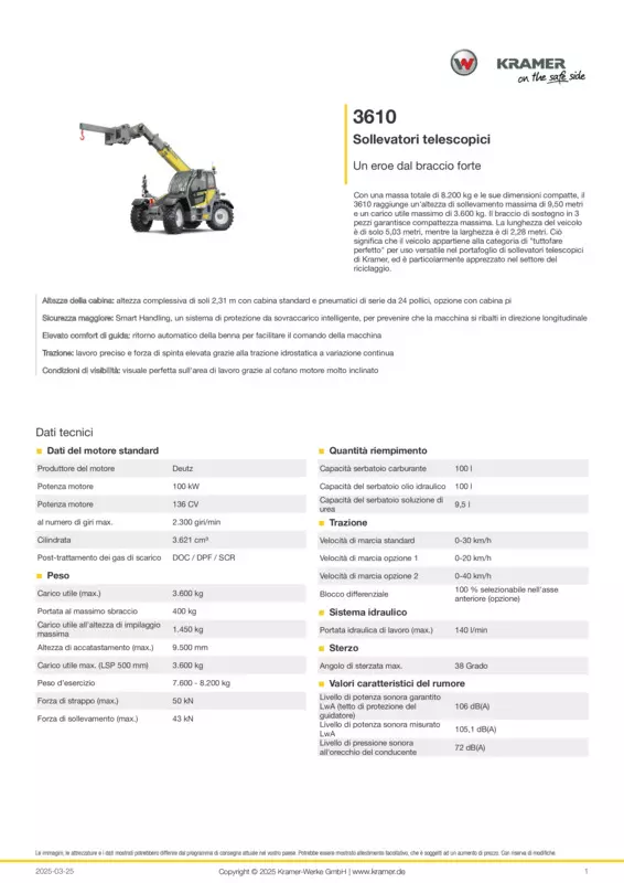 Con una massa totale di 8.200 kg e le sue dimensioni compatte, il 3610 raggiunge un'altezza di sollevamento massima di 9,50 metri e un carico utile massimo di 3.600 kg. Il braccio di sostegno in 3 pezzi garantisce compattezza massima. La lunghezza del veicolo è di solo 5,03 metri, mentre la larghezza è di 2,28 metri. Ciò significa che il veicolo appartiene alla categoria di "tuttofare perfetto" per uso versatile nel portafoglio di sollevatori telescopici di Kramer, ed è particolarmente apprezzato nel settore del riciclaggio.