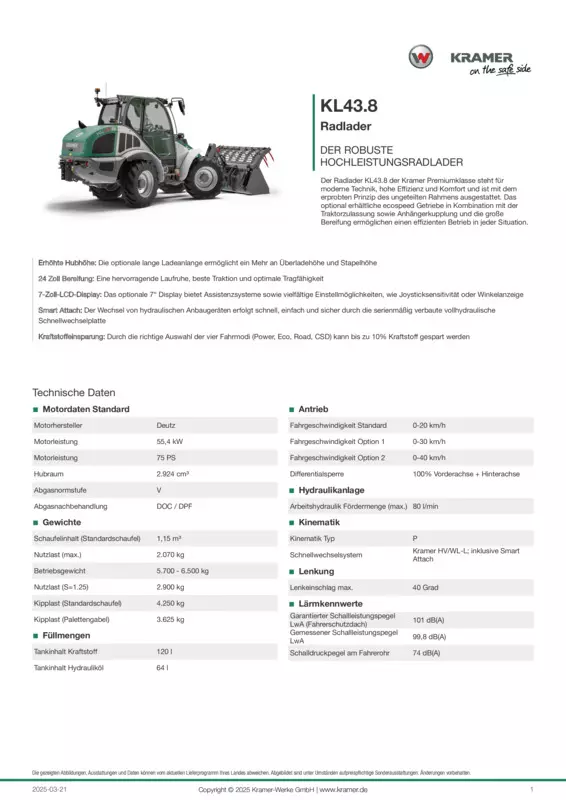 Der Radlader KL43.8 der Kramer Premiumklasse steht für moderne Technik, hohe Effizienz und Komfort und ist mit dem erprobten Prinzip des ungeteilten Rahmens ausgestattet. Das optional erhältliche ecospeed Getriebe in Kombination mit der Traktorzulassung sowie Anhängerkupplung und die große Bereifung ermöglichen einen effizienten Betrieb in jeder Situation.