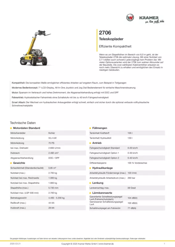 Wenn es um Stapelhöhen im Bereich von 6,0 m geht, ist der Teleskoplader 2706 die optimale Lösung. Mit einer Nutzlast von 2,7 t stellen auch schwere Ladevorgänge kein Problem dar. Mit vielen Optionsvarianten wird der 2706 zum wahren Allrounder auf der Baustelle. Die zwei wählbaren Kabinenhöhen erlauben es noch mehr Übersicht zu erhalten und ermöglichen den Einsatz in niedrigen Gebäuden.
