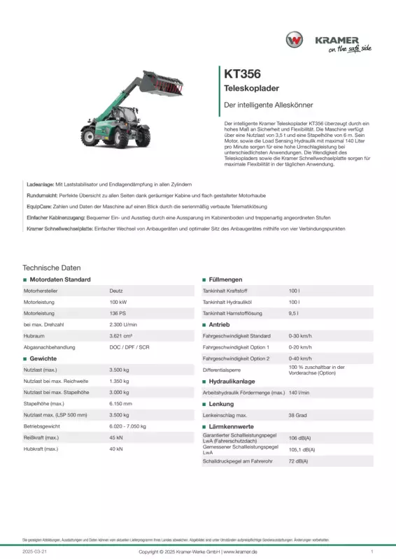 Der intelligente Kramer Teleskoplader KT356 überzeugt durch ein hohes Maß an Sicherheit und Flexibilität. Die Maschine verfügt über eine Nutzlast von 3,5 t und eine Stapelhöhe von 6 m. Sein Motor, sowie die Load Sensing Hydraulik mit maximal 140 Liter pro Minute sorgen für eine hohe Umschlagleistung bei unterschiedlichsten Anwendungen. Die Wendigkeit des Teleskopladers sowie die Kramer Schnellwechselplatte sorgen für maximale Flexibilität in der täglichen Anwendung.