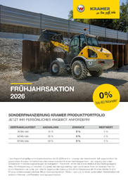 * Das Angebot ist in Deutschland und Österreich bis 30.06.2026 gültig und nur solange der Vorrat reicht. Gilt ausschließlich für gewerbliche Kunden. Erhältlich bei allen teilnehmenden Kramer Vertriebspartnern. Der Eingang des unterschriebenen Finanzierungsvertrages ist maßgeblich. Die MwSt. ist mit der ersten Mietkaufrate (Vertragsbeginn) fällig. Bonitätsprüfung vorbehalten. Es gelten die Vertragsbedingungen von Kramer Finance. Kramer Finance ist ein Handelsname, unter dem die De Lage Landen Leasing GmbH mit Gestattung der Kramer-Werke GmbH Finanzdienstleistungen erbringt. Bilder sind exemplarisch. Änderungen und Irrtümer vorbehalten. Kombination mit anderen Aktionen und Rabatten sind ausgeschlossen.