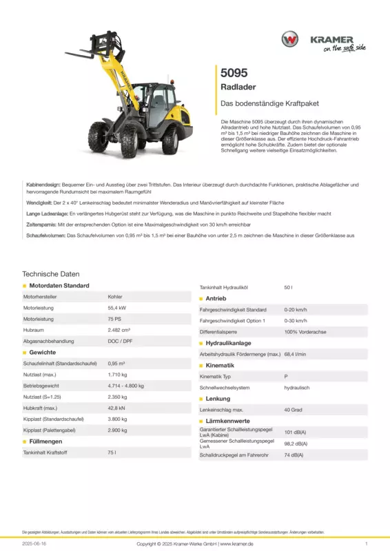 Die Maschine 5095 überzeugt durch ihren dynamischen Allradantrieb und hohe Nutzlast. Das Schaufelvolumen von 0,95 m³ bis 1,5 m³ bei niedriger Bauhöhe zeichnen die Maschine in dieser Größenklasse aus. Der effiziente Hochdruck-Fahrantrieb ermöglicht hohe Schubkräfte. Zudem bietet der optionale Schnellgang weitere vielseitige Einsatzmöglichkeiten.
