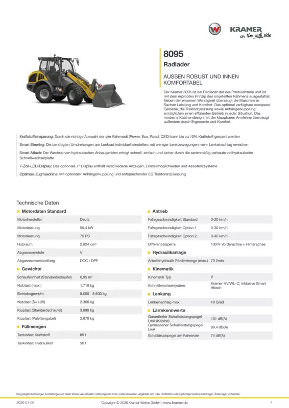 Der Kramer 8095 ist ein Radlader der 8er-Premiumserie und ist mit dem erprobten Prinzip des ungeteilten Rahmens ausgestattet. Neben der enormen Wendigkeit überzeugt die Maschine in Sachen Leistung und Komfort. Das optional verfügbare ecospeed Getriebe, die Traktorzulassung sowie Anhängerkupplung ermöglichen einen effizienten Betrieb in jeder Situation. Das moderne Kabinendesign mit der klappbaren Armlehne überzeugt außerdem durch Ergonomie und Komfort.