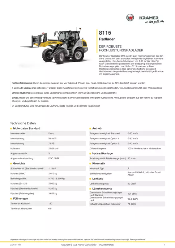 Der Kramer Radlader 8115 gehört zum Premiumsegment der 8er-Serie und ist mit dem erprobten Prinzip des ungeteilten Rahmens ausgestattet. Das Schaufelvolumen von 1,15 m³ bis 1,8 m³ je nach Materialdichte gepaart mit der einzigartig leistungsstarken Motorisierungsoption macht den 8115 zu einem echten Hochleistungsradlader. Das optional erhältliche ecospeed Getriebe und die große Bereifung ermöglichen vielfältige Einsätze mit dieser Maschine.