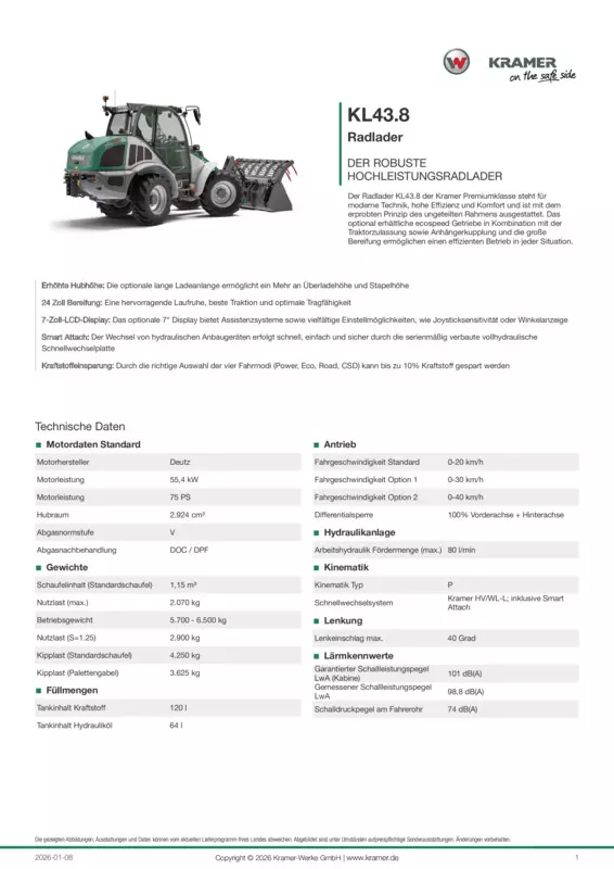 Der Radlader KL43.8 der Kramer Premiumklasse steht für moderne Technik, hohe Effizienz und Komfort und ist mit dem erprobten Prinzip des ungeteilten Rahmens ausgestattet. Das optional erhältliche ecospeed Getriebe in Kombination mit der Traktorzulassung sowie Anhängerkupplung und die große Bereifung ermöglichen einen effizienten Betrieb in jeder Situation.