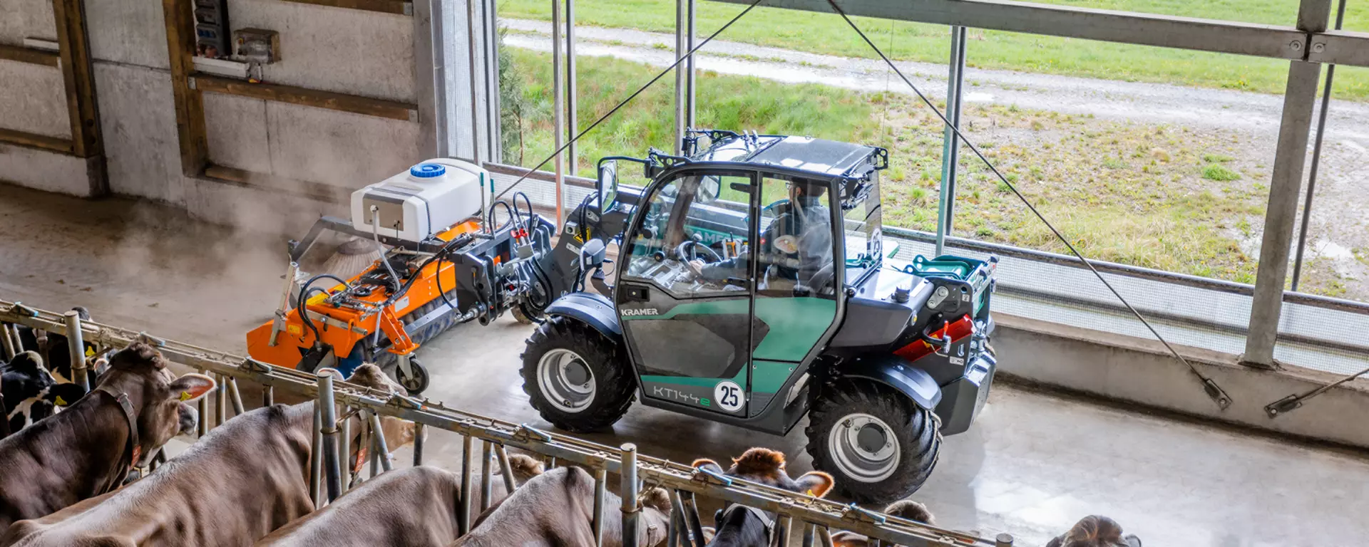 Der vollelektrische Kramer Teleskoplader KT144e beim Reinigen eines Kuhstalls.