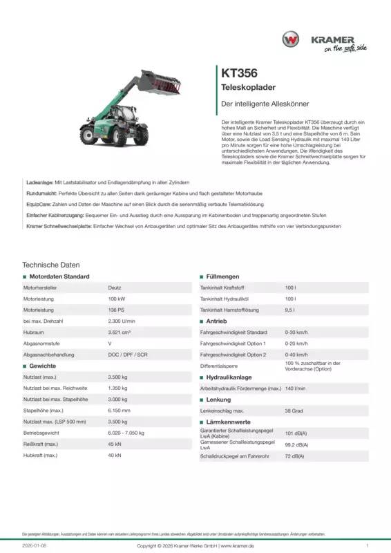 Der intelligente Kramer Teleskoplader KT356 überzeugt durch ein hohes Maß an Sicherheit und Flexibilität. Die Maschine verfügt über eine Nutzlast von 3,5 t und eine Stapelhöhe von 6 m. Sein Motor, sowie die Load Sensing Hydraulik mit maximal 140 Liter pro Minute sorgen für eine hohe Umschlagleistung bei unterschiedlichsten Anwendungen. Die Wendigkeit des Teleskopladers sowie die Kramer Schnellwechselplatte sorgen für maximale Flexibilität in der täglichen Anwendung.