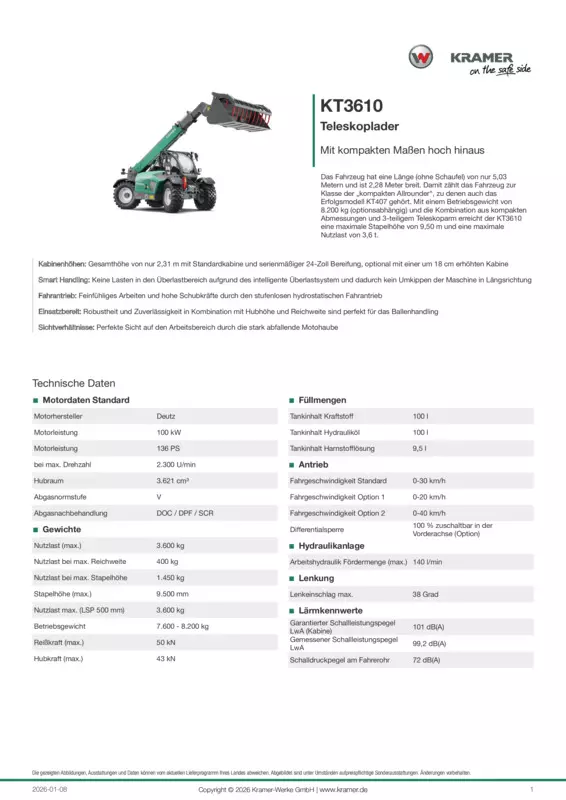 Das Fahrzeug hat eine Länge (ohne Schaufel) von nur 5,03 Metern und ist 2,28 Meter breit. Damit zählt das Fahrzeug zur Klasse der „kompakten Allrounder“, zu denen auch das Erfolgsmodell KT407 gehört. Mit einem Betriebsgewicht von 8.200 kg (optionsabhängig) und die Kombination aus kompakten Abmessungen und 3-teiligem Teleskoparm erreicht der KT3610 eine maximale Stapelhöhe von 9,50 m und eine maximale Nutzlast von 3,6 t.