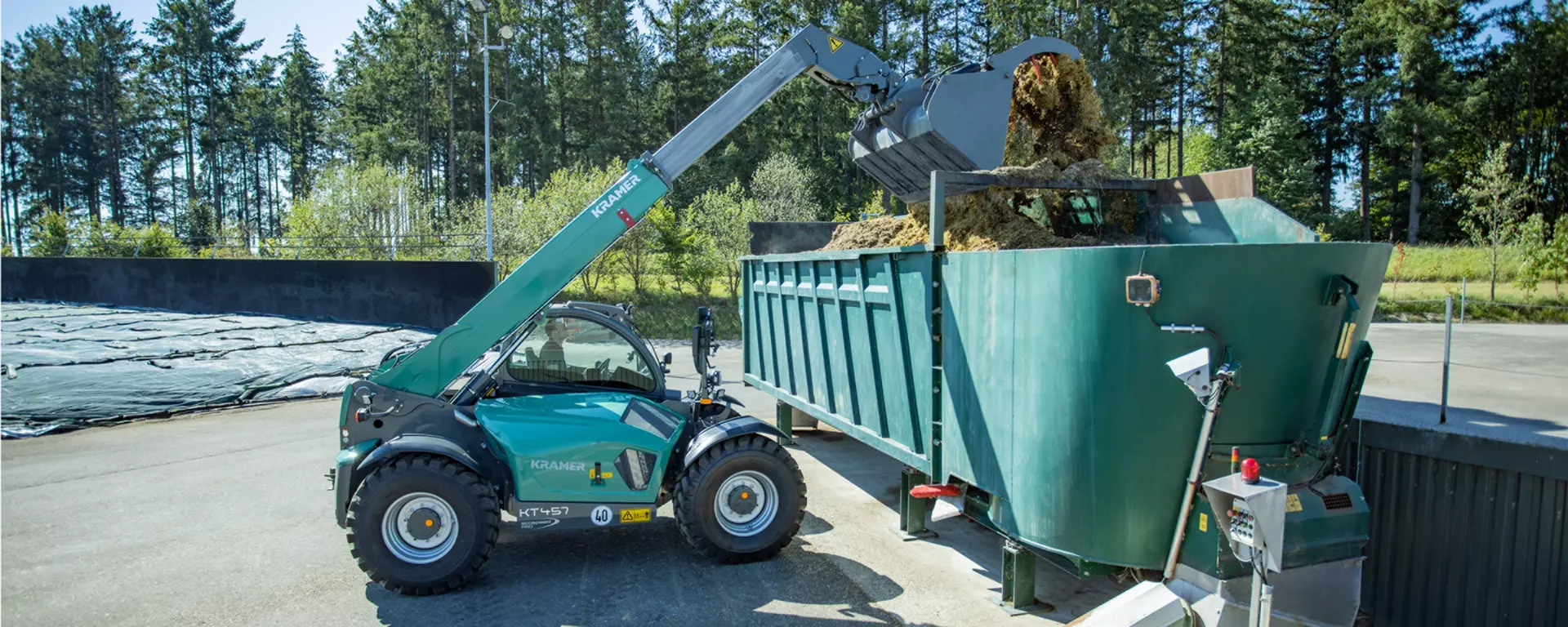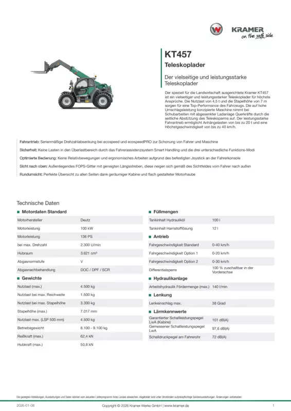 Der speziell für die Landwirtschaft ausgerichtete Kramer KT457 ist ein vielseitiger und leistungsstarker Teleskoplader für höchste Ansprüche. Die Nutzlast von 4,5 t und die Stapelhöhe von 7 m sorgen für eine Top-Performance des Fahrzeugs. Die auf hohe Umschlagsleistung konzipierte Maschine nimmt bei Schubarbeiten mit abgesenkter Ladanlage Querkräfte durch die seitliche Abstützung des Teleskoparms auf. Der leistungsstarke Fahrantrieb ermöglicht Anhängelasten von bis zu 20 t und eine Höchstgeschwindigkeit von bis zu 40 km/h.