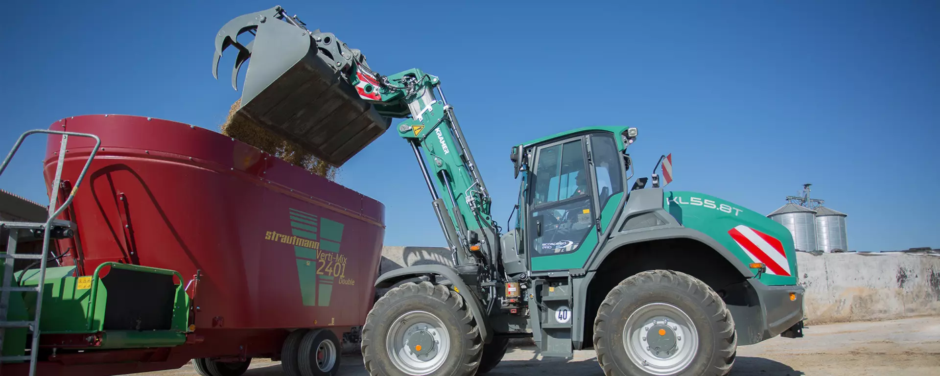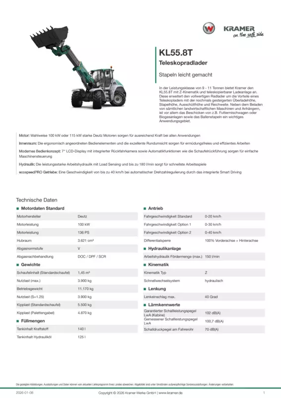 In der Leistungsklasse von 9 - 11 Tonnen bietet Kramer den KL55.8T mit Z-Kinematik und teleskopierbarer Ladeanlage an. Diese erweitert den vollwertigen Radlader um die Vorteile eines Teleskopladers mit der nochmals gesteigerten Überladehöhe, Stapelhöhe, Ausschütthöhe und Reichweite. Neben dem Beladen von sämtlichen landwirtschaftlichen Maschinen und Anhängern, ist vor allem das Beschicken von z.B. Futtermischwagen oder Biogasanlagen sowie das Ballenstapeln ein wichtiges Anwendungsgebiet.