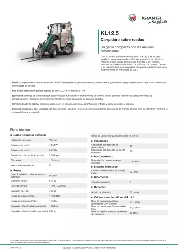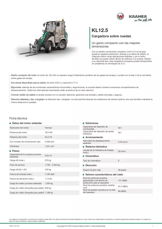 Con su diseño sumamente compacto, la KL12.5 es de gran ayuda en espacios estrechos. Gracias a su altura de diseño, la máquina ofrece varias aplicaciones distintas y, por lo tanto, también se puede utilizar dentro de edificios o en aceras. Debido a su reducida tara, esta cargadora compacta puede transportarse sin problemas en remolques de 3,5 t.