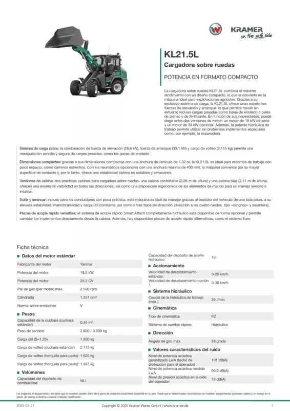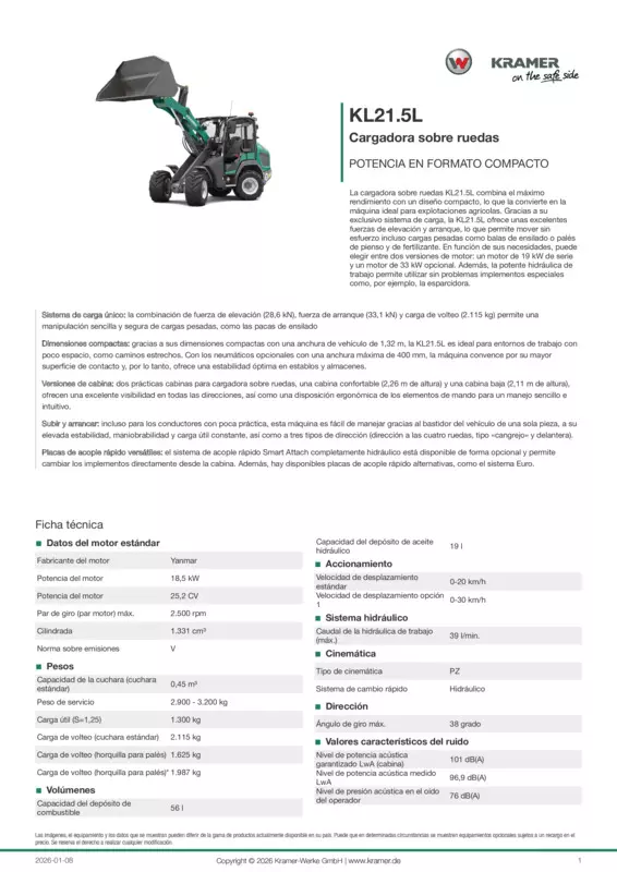 La cargadora sobre ruedas KL21.5L combina el máximo rendimiento con un diseño compacto, lo que la convierte en la máquina ideal para explotaciones agrícolas. Gracias a su exclusivo sistema de carga, la KL21.5L ofrece unas excelentes fuerzas de elevación y arranque, lo que permite mover sin esfuerzo incluso cargas pesadas como balas de ensilado o palés de pienso y de fertilizante. En función de sus necesidades, puede elegir entre dos versiones de motor: un motor de 19 kW de serie y un motor de 33 kW opcional. Además, la potente hidráulica de trabajo permite utilizar sin problemas implementos especiales como, por ejemplo, la esparcidora.