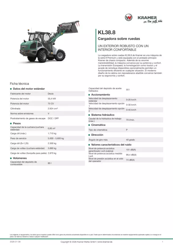 La cargadora sobre ruedas KL38.8 de Kramer es una máquina de la serie 8 Premium y está equipada con el probado principio Kramer de chasis compacto. Además de su enorme maniobrabilidad, la máquina convence por su potencia y confort. La transmisión Ecospeed, la homologación como tractor y el acople de remolque disponibles opcionalmente permiten un funcionamiento eficiente en cualquier situación. El moderno diseño de la cabina con reposabrazos abatible convence también por su ergonomía y confort.