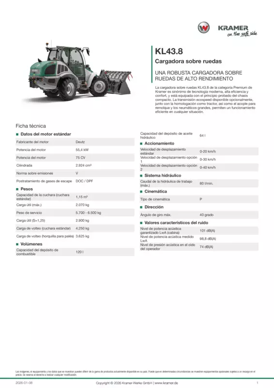 La cargadora sobre ruedas KL43.8 de la categoría Premium de Kramer es sinónimo de tecnología moderna, alta eficiencia y confort, y está equipada con el principio probado del chasis compacto. La transmisión ecospeed disponible opcionalmente, junto con la homologación como tractor, así como el acople para remolque y los neumáticos grandes, permiten un funcionamiento eficiente en cualquier situación.