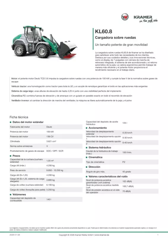 La cargadora sobre ruedas KL60.8 de Kramer se ha diseñado para satisfacer ante todo las necesidades de los clientes. Destaca por sus cuidados detalles y sus innovaciones técnicas, como el display de 7 pulgadas con cámara de marcha de retroceso integrada, el sistema de aire acondicionado y el retorno automático de la pala. La cabina ergonómica permite trabajar de manera más eficiente y el potente motor proporciona el rendimiento necesario en el trabajo diario.