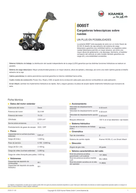 La potente 8085T está equipada de serie con un motor Deutz de 55 kW. El diseño de caja estrecho del sistema de carga telescópico garantiza una visibilidad óptima. La cargadora sobre ruedas telescópica permite un mayor alcance, así como una mayor altura de apilamiento y de descarga. Asimismo, el bastidor compacto del vehículo en este modelo también garantiza una carga útil y una estabilidad constantes.