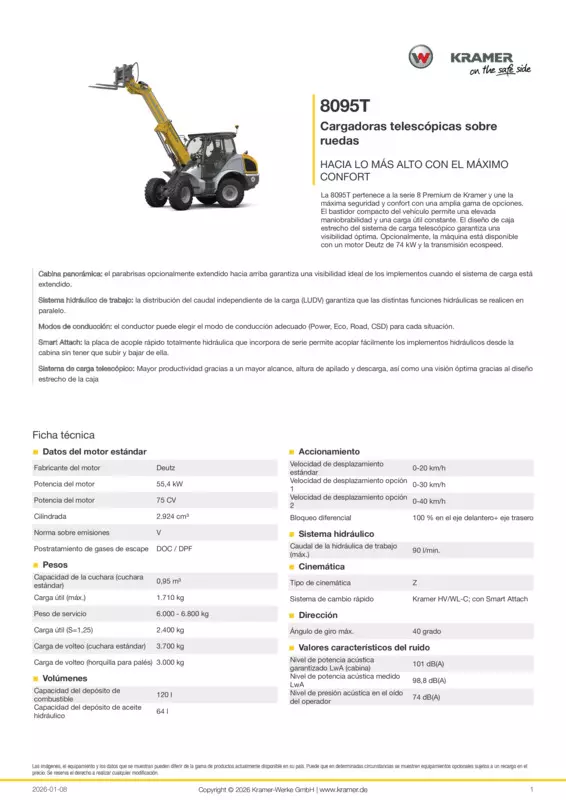 La 8095T pertenece a la serie 8 Premium de Kramer y une la máxima seguridad y confort con una amplia gama de opciones. El bastidor compacto del vehículo permite una elevada maniobrabilidad y una carga útil constante. El diseño de caja estrecho del sistema de carga telescópico garantiza una visibilidad óptima. Opcionalmente, la máquina está disponible con un motor Deutz de 74 kW y la transmisión ecospeed.
