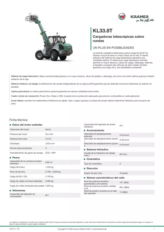 La potente cargadora telescópica sobre ruedas KL33.8T de Kramer incluye de serie un motor Deutz de 55 kW. El diseño estrecho del sistema de carga telescópico garantiza una visibilidad óptima. El sistema de carga telescópico también permite un mayor alcance y altura de carga y descarga. Además, el bastidor compacto del vehículo de este modelo también garantiza una carga útil y una estabilidad constantes.