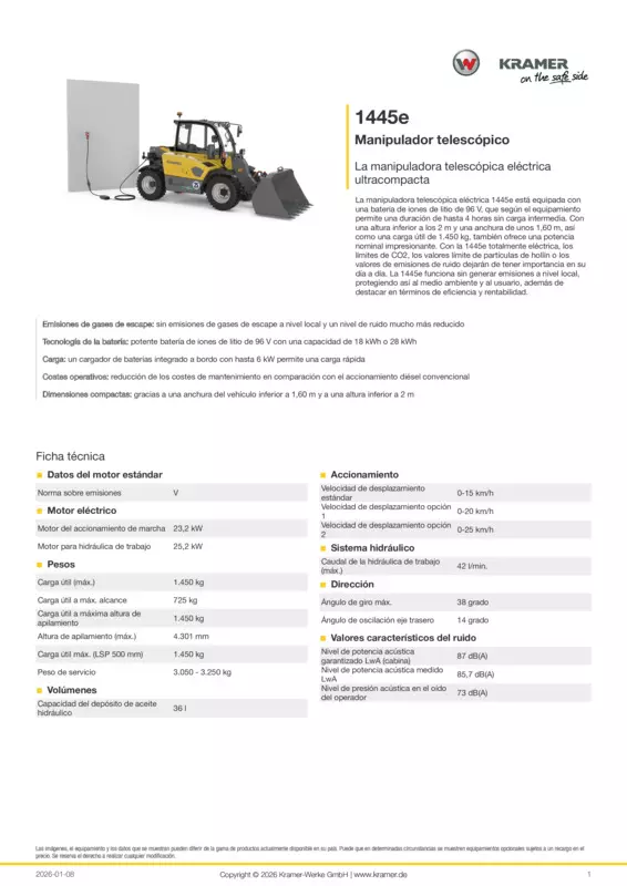 La manipuladora telescópica eléctrica 1445e está equipada con una batería de iones de litio de 96 V, que según el equipamiento permite una duración de hasta 4 horas sin carga intermedia. Con una altura inferior a los 2 m y una anchura de unos 1,60 m, así como una carga útil de 1.450 kg, también ofrece una potencia nominal impresionante. Con la 1445e totalmente eléctrica, los límites de CO2, los valores límite de partículas de hollín o los valores de emisiones de ruido dejarán de tener importancia en su día a día. La 1445e funciona sin generar emisiones a nivel local, protegiendo así al medio ambiente y al usuario, además de destacar en términos de eficiencia y rentabilidad.