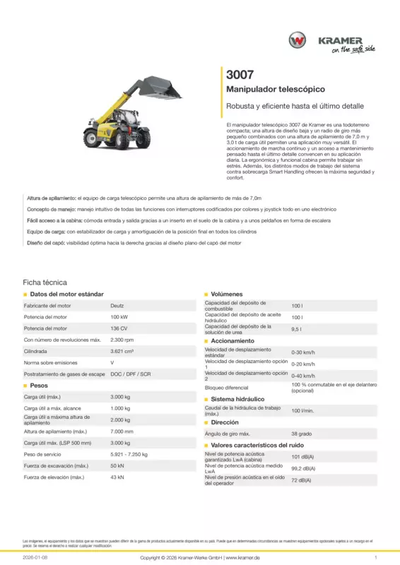 El manipulador telescópico 3007 de Kramer es una todoterreno compacta; una altura de diseño baja y un radio de giro más pequeño combinados con una altura de apilamiento de 7,0 m y 3,0 t de carga útil permiten una aplicación muy versátil. El accionamiento de marcha continuo y un acceso a mantenimiento pensado hasta el último detalle convencen en su aplicación diaria. La ergonómica y funcional cabina permite trabajar sin estrés. Además, los distintos modos de trabajo del sistema contra sobrecarga Smart Handling ofrecen la máxima seguridad y confort.