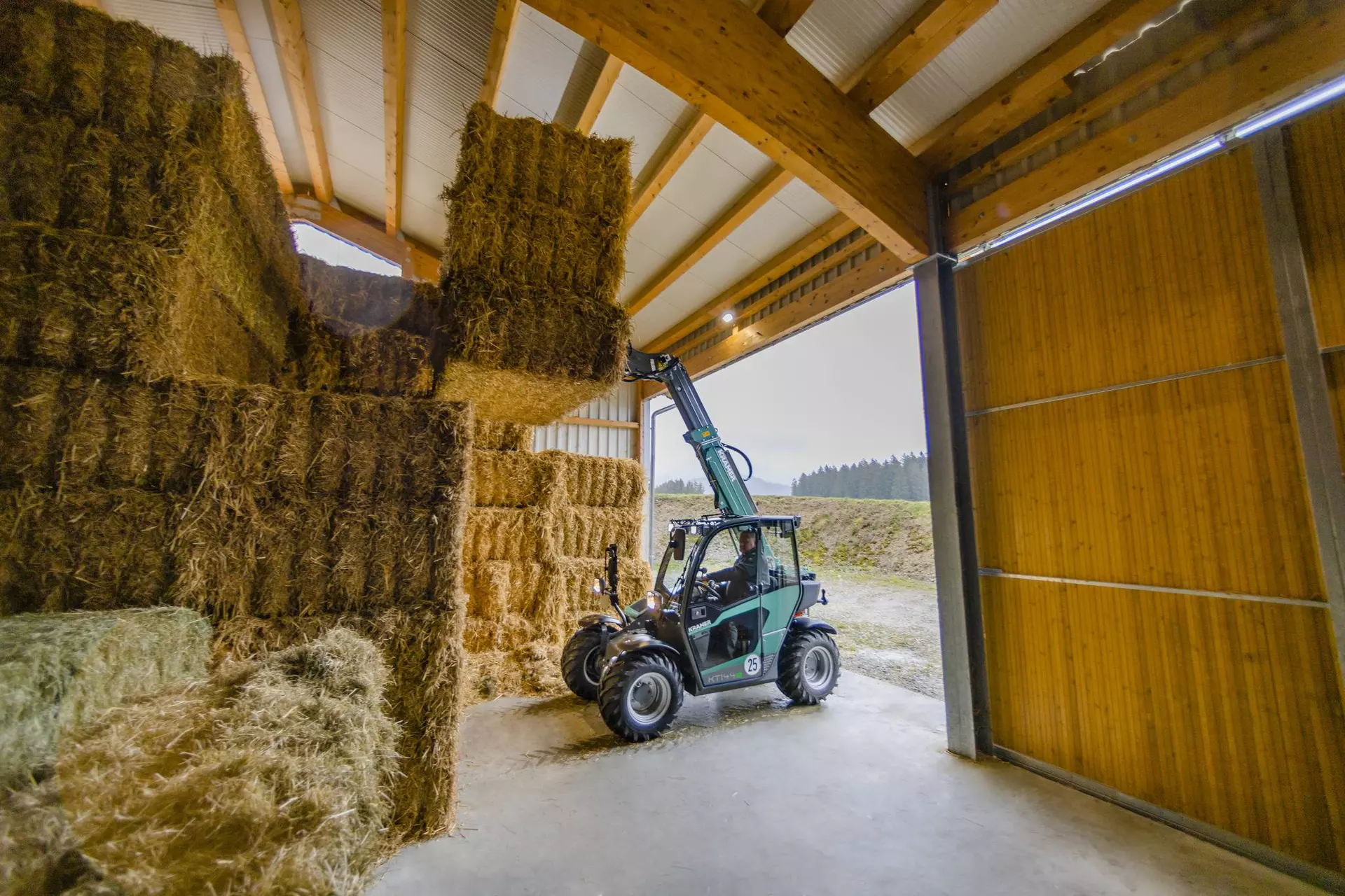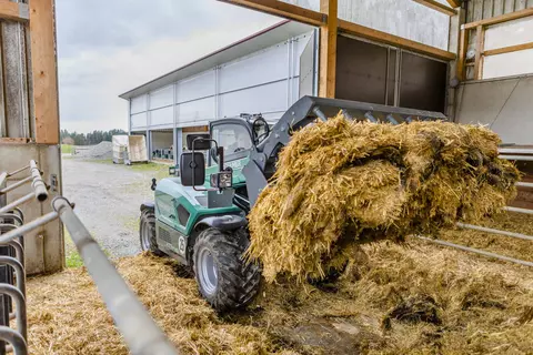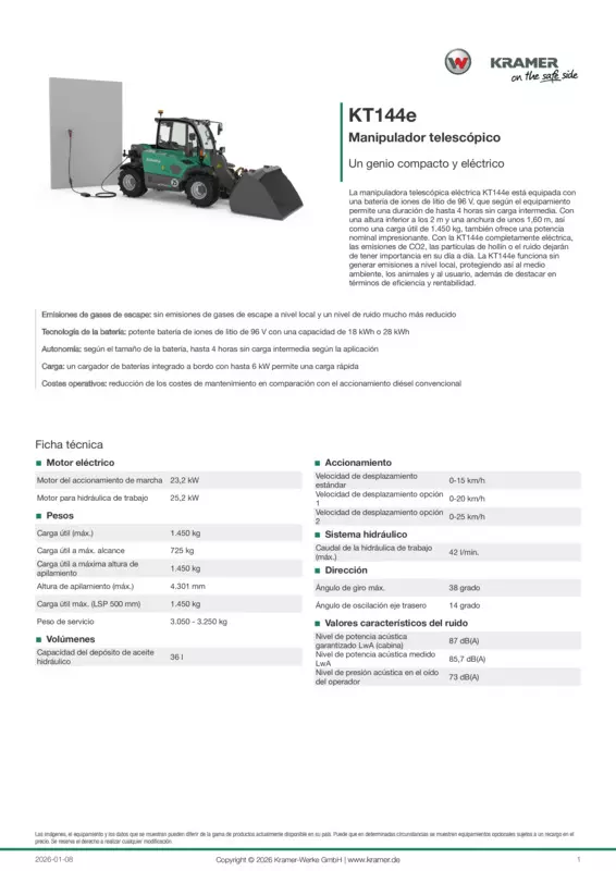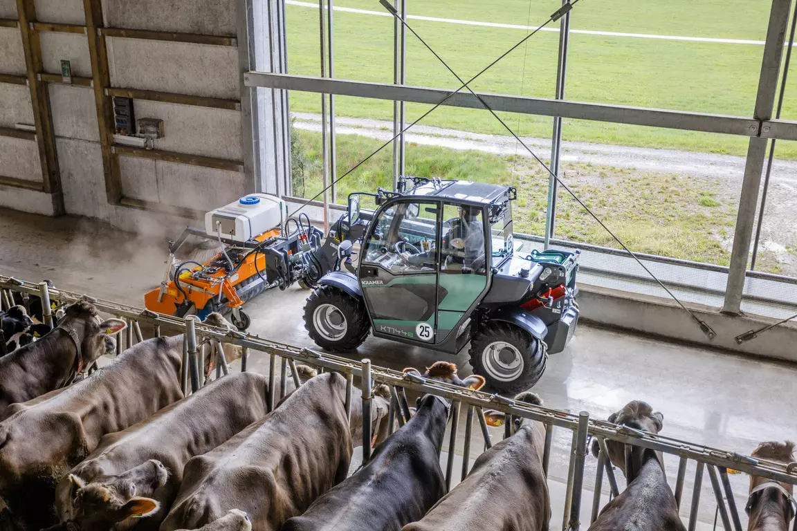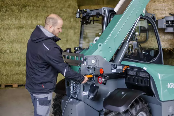 La manipuladora telescópica eléctrica KT144e está equipada con una batería de iones de litio de 96 V, que según el equipamiento permite una duración de hasta 4 horas sin carga intermedia. Con una altura inferior a los 2 m y una anchura de unos 1,60 m, así como una carga útil de 1.450 kg, también ofrece una potencia nominal impresionante. Con la KT144e completamente eléctrica, las emisiones de CO2, las partículas de hollín o el ruido dejarán de tener importancia en su día a día. La KT144e funciona sin generar emisiones a nivel local, protegiendo así al medio ambiente, los animales y al usuario, además de destacar en términos de eficiencia y rentabilidad.
